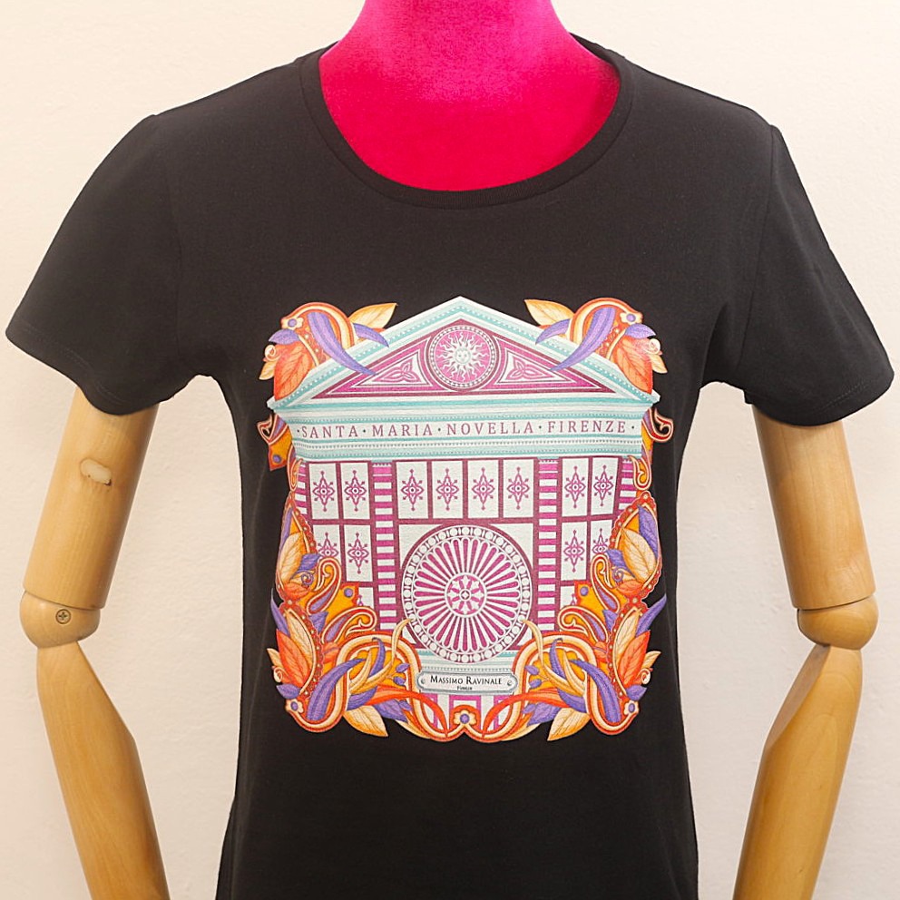 In this T-shirt, the facade of Santa Maria Novella by Leon Battista Alberti, reinterpreted with vibrant colors and soft lines, becomes a graphic element that blends tradition and modernity. A fusion of art, design, and authentic Made in Italy spirit.
